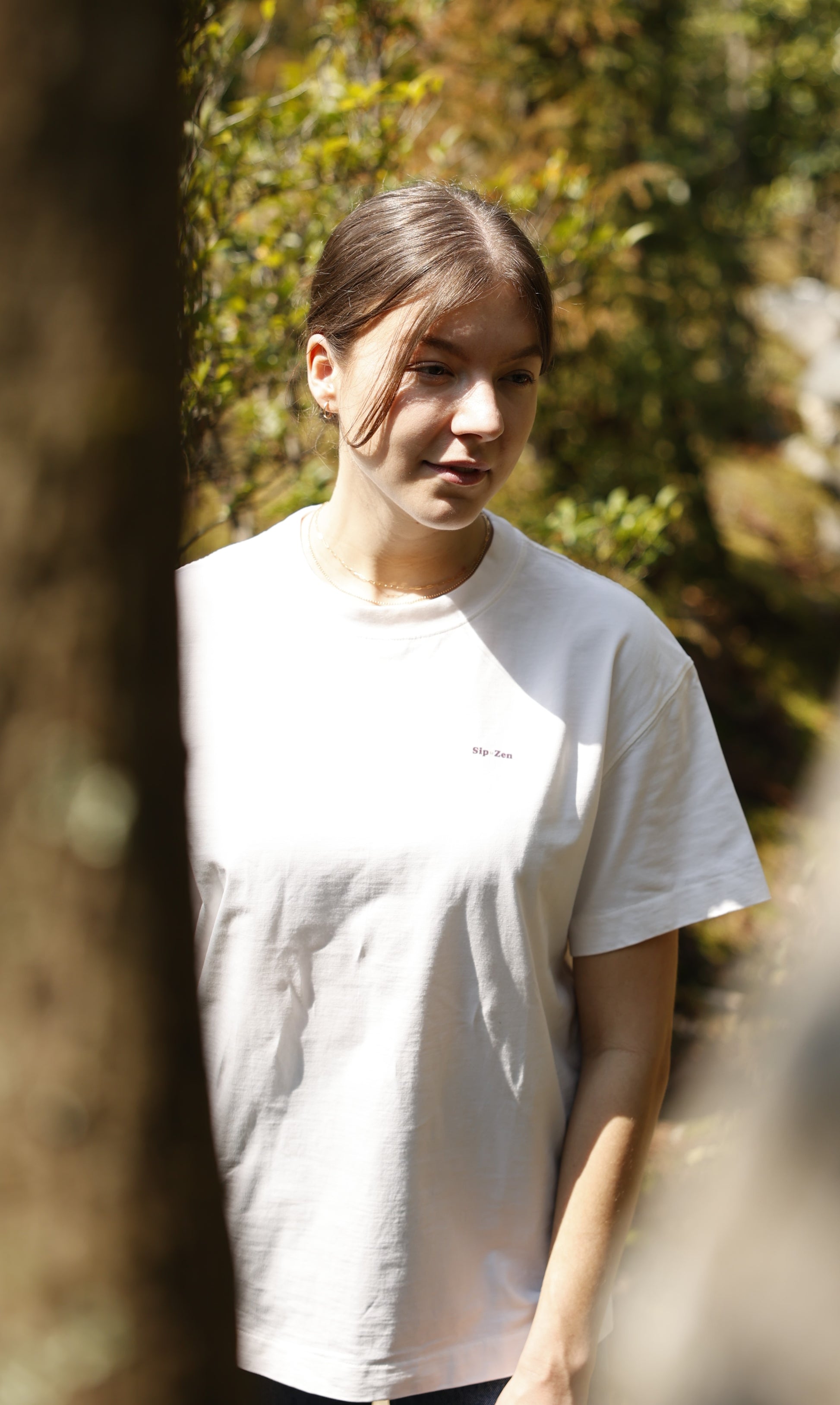 A unisex off-white oversized tee with the Sip To Zen exclusive print 'Hi there hottea' in dark red.